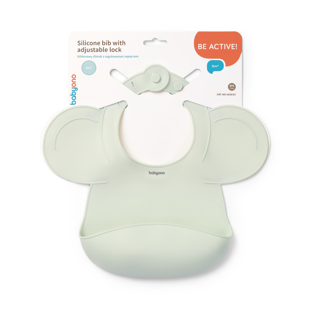 A szilikon előke tökéletesen beállítható, illeszkedik a baba testéhez, kényelmet biztosítva.