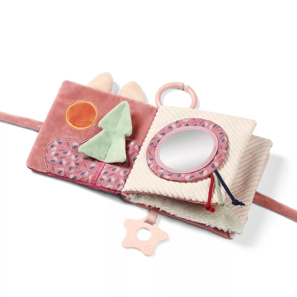 Stimuláló könyvünk lapjai tartalmaznak egy susogó elemet, amely gyűréskor érdekes hangokat ad ki, egy csörgőt, amely rázásra ösztönzi, egy tükröt, amely lehetővé teszi gyermeke számára, hogy felfedezze saját tükörképét, címkéket és zsinórokat, amelyek ösztönzik a fogást, valamint egy rágókát, amely masszírozza az ínyét.