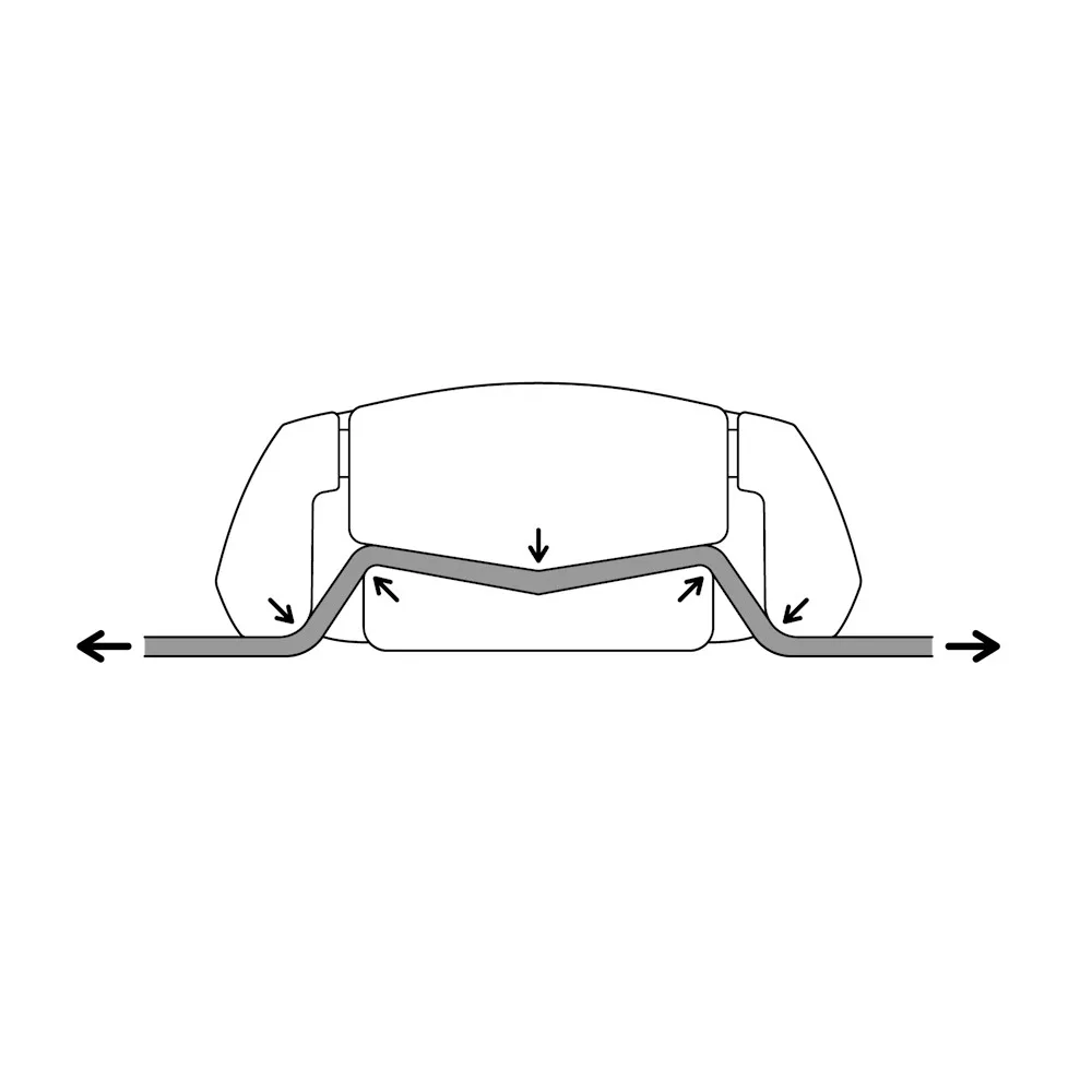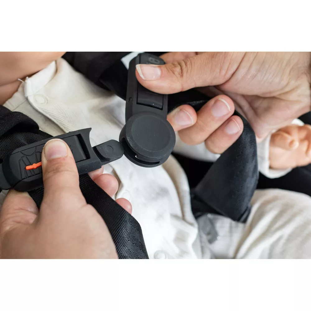 A biztonságö öv összefogó csat a vállhevederek feszességét használja a pozícióban maradáshoz, ezzel gyakorlatilag lehetetlenné teszi azt, hogy a gyermek az övet lenyomja.