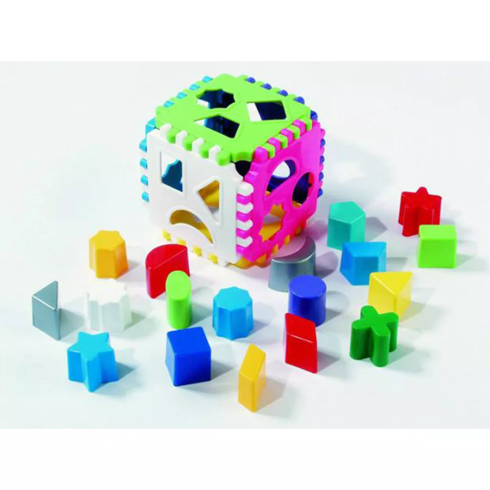 Csodakocka babáknak - összeépíthető színes oldallapokból álló kocka, rajta különböző forma kivágások - klasszikus forma felismerő játék, be kell helyezni a kis elemeket a megfelelő nyíláson.