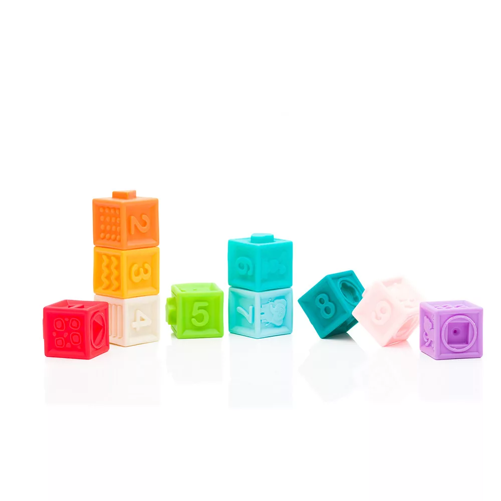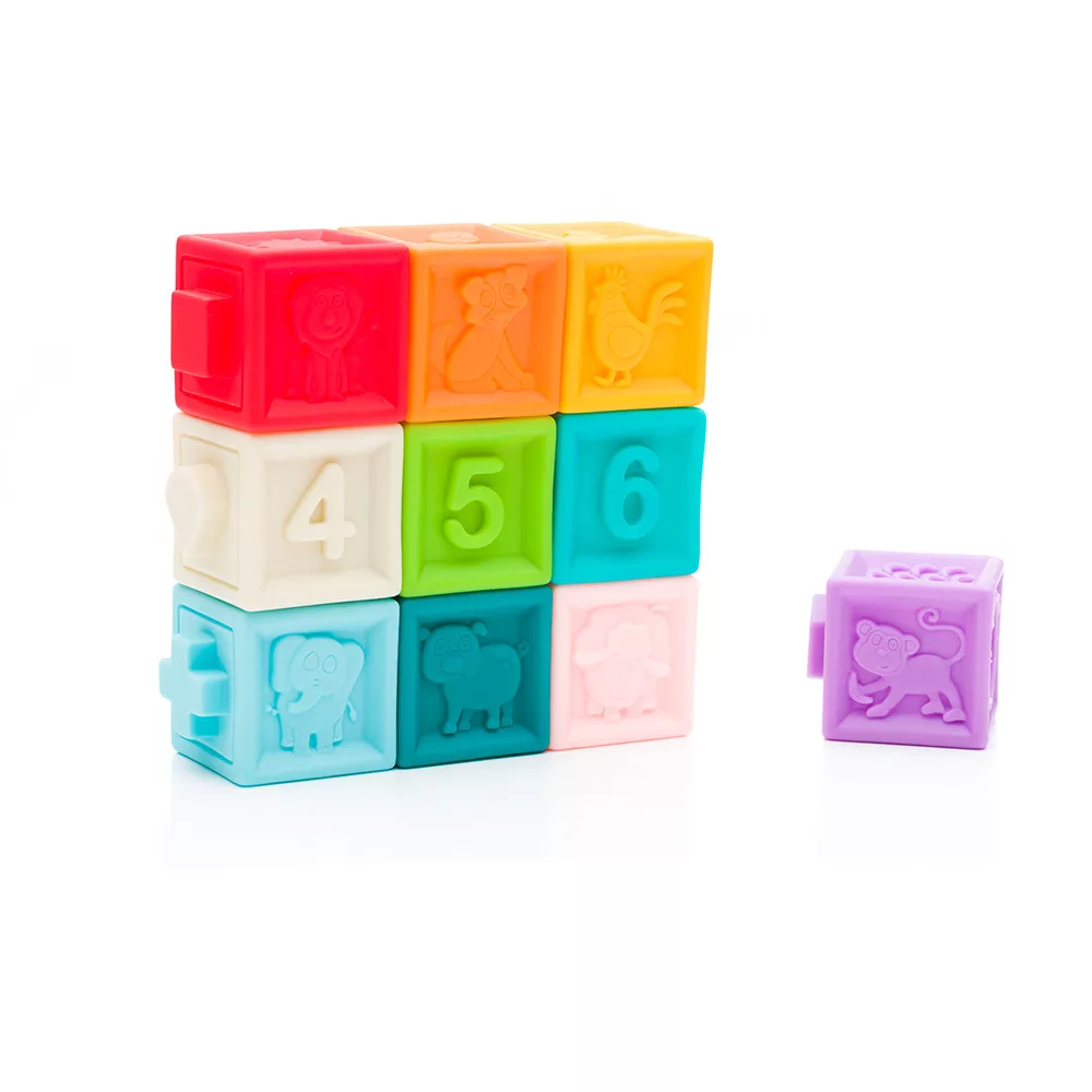 Összeépíthető különböző színű puha kockák rajtuk különböző felületekkel, számokkal, állatokkal.