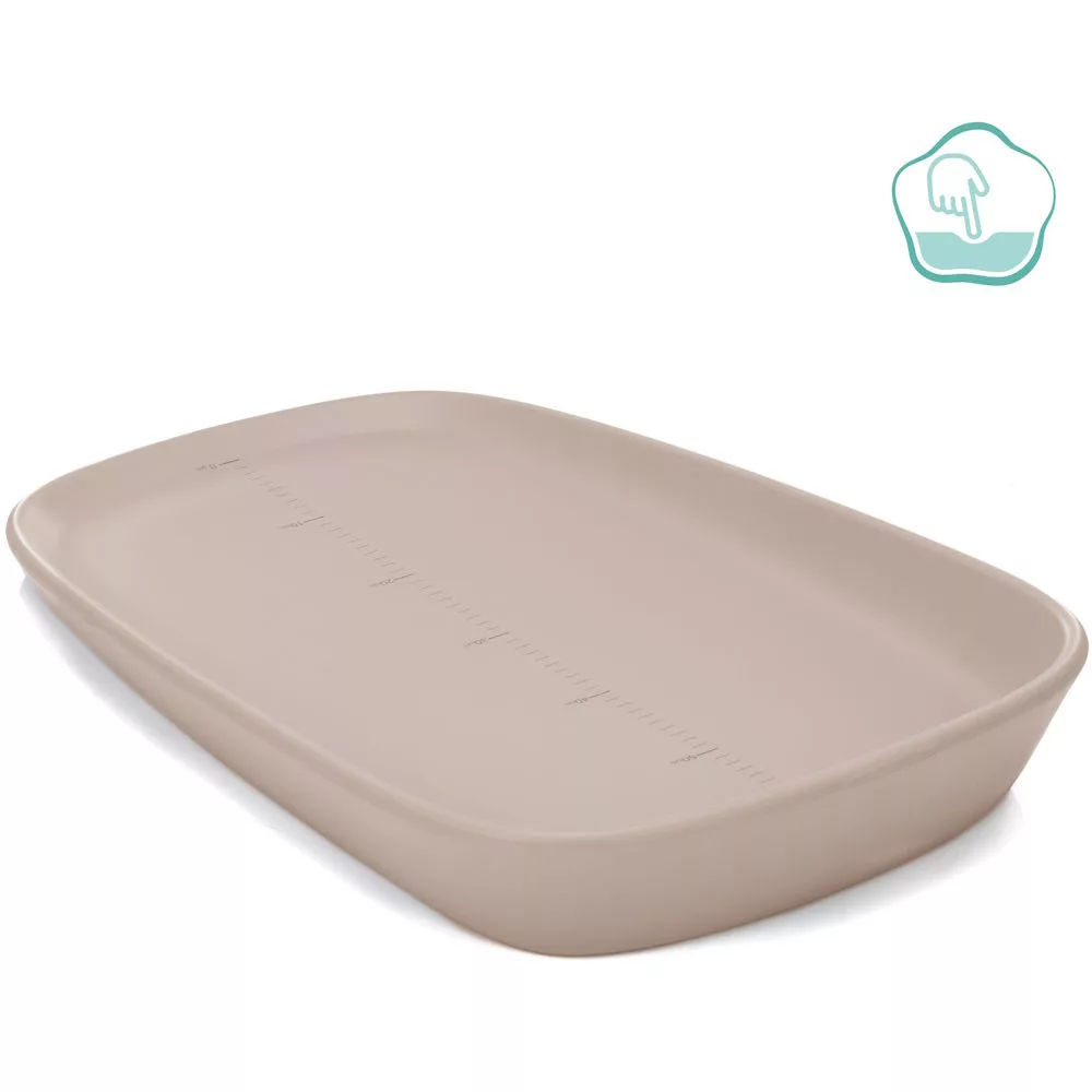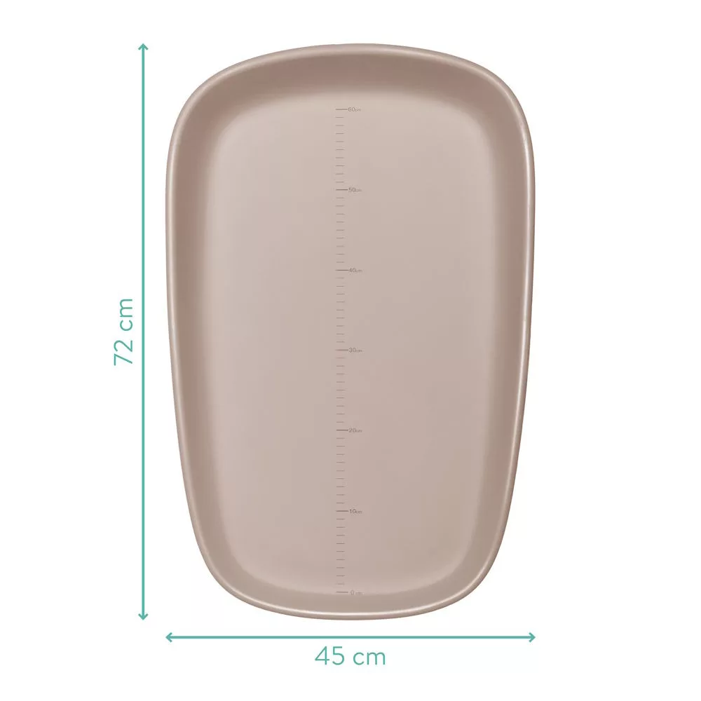 A nagyméretű, 72 × 45 cm-es méretnek köszönhetően a babának rengeteg helye van a mozgásra, míg a megemelt szélek nagyobb biztonságot nyújtanak. A felület könnyen tisztítható, így ideális mindennapi használatra – akár a fürdőszobában, a gyerekszobában vagy a komódon. További részlet a fekvőfelületen található nyomtatott skála – így könnyedén figyelemmel kísérheti, ahogy a kicsi napról napra növekszik. Az időtlen, semleges szürke dizájn tökéletessé teszi bármilyen otthonba.