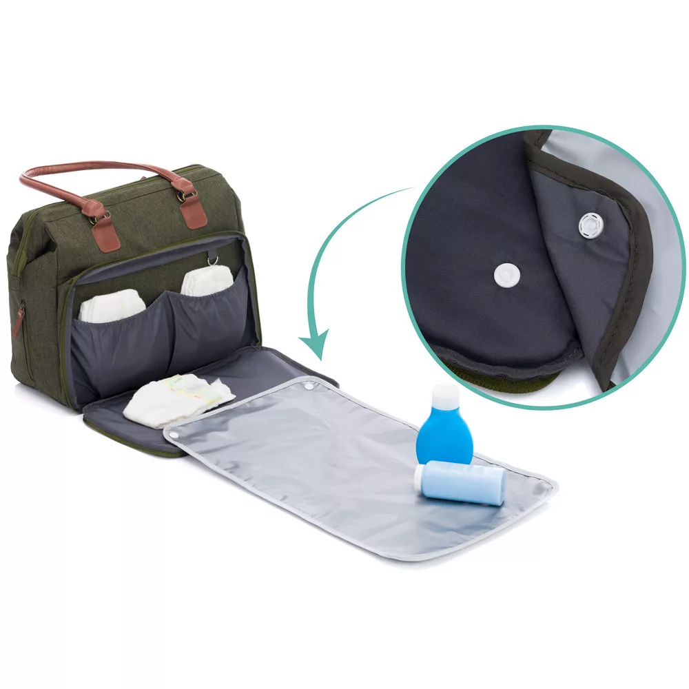 A pelenkázó alátét és az értéktárgyak a hátul található nagy zsebben tárolhatók, míg az elülső két kis zseb tökéletes a cumi és egyéb babakellékek tárolására. Két extra cipzár is található az oldalán. Az egyik lehetővé teszi a pelenkázótáska tartalmának gyors elérését, a másik pedig termikus anyaggal van bélelve, így hosszabb ideig melegen tartja a cumisüveget, vagy későbbi használat esetén hosszabb ideig hűvösen tartja anya vagy apa italát.