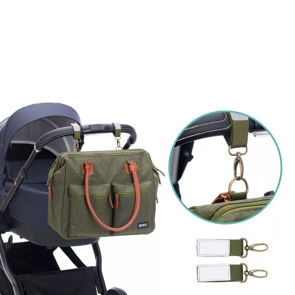 A pelenkázótáska tetején két rögzítőkampó található, amelyek megkönnyítik a babakocsi tolókarjára rögzítését. További biztonsági funkcióként ezek a csatok visszaverik az autó fényszóróinak fényét éjszaka vagy szürkületben.