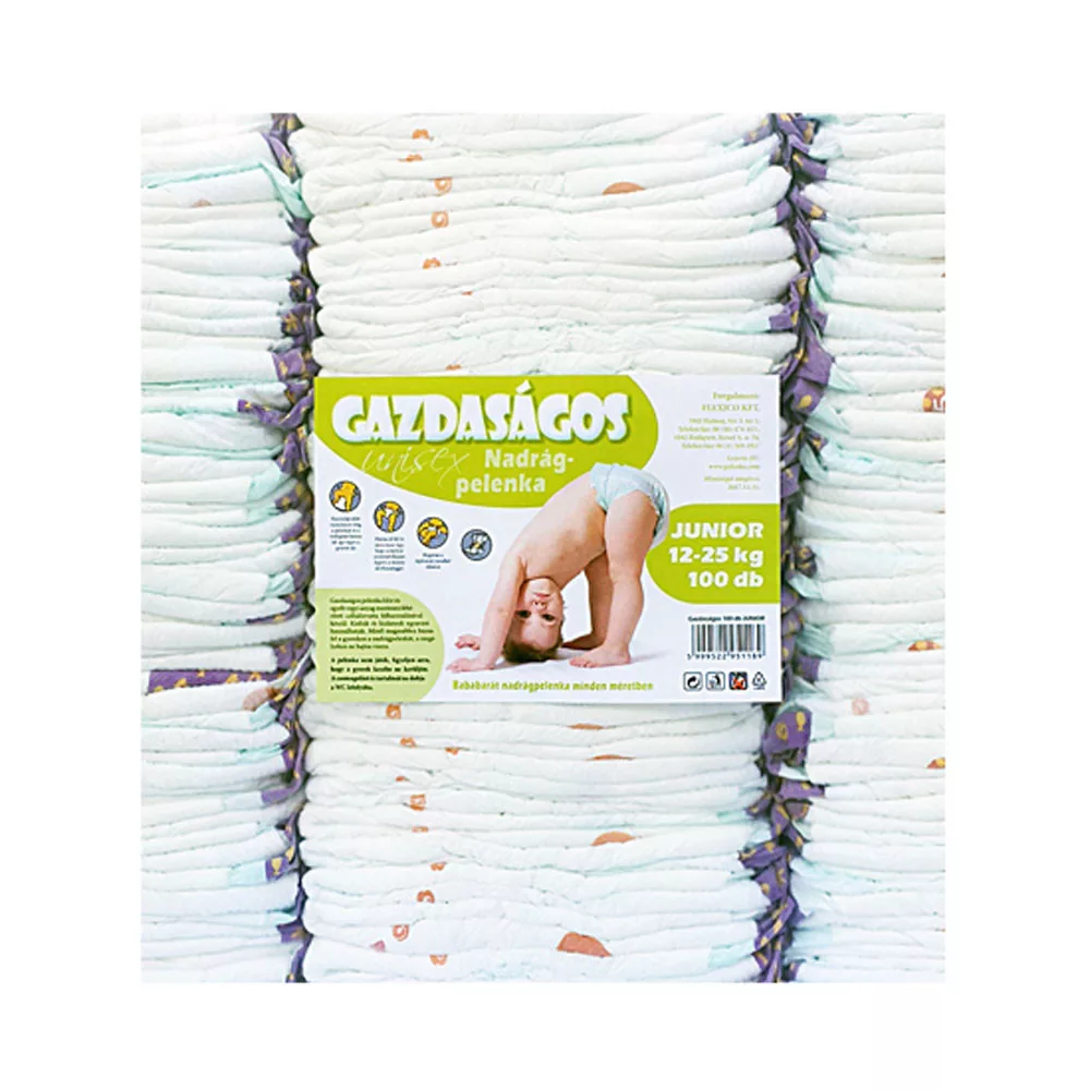 Jó minőségű, nagy kiszerelésű, tépőzáras nadrágpelenka, változatos, vidám mintákkal. A pelenkázás könnyű és gazdaságos, mivel az ára olcsó, megfizethető. Textiles borítású, légáteresztős, tépőzáras, többször nyitható, zárható. Uniszex pelenka azaz kisfiúk és kislányok egyaránt hordhatják.