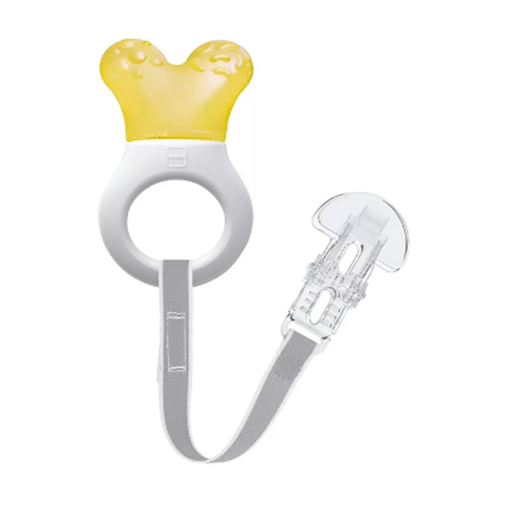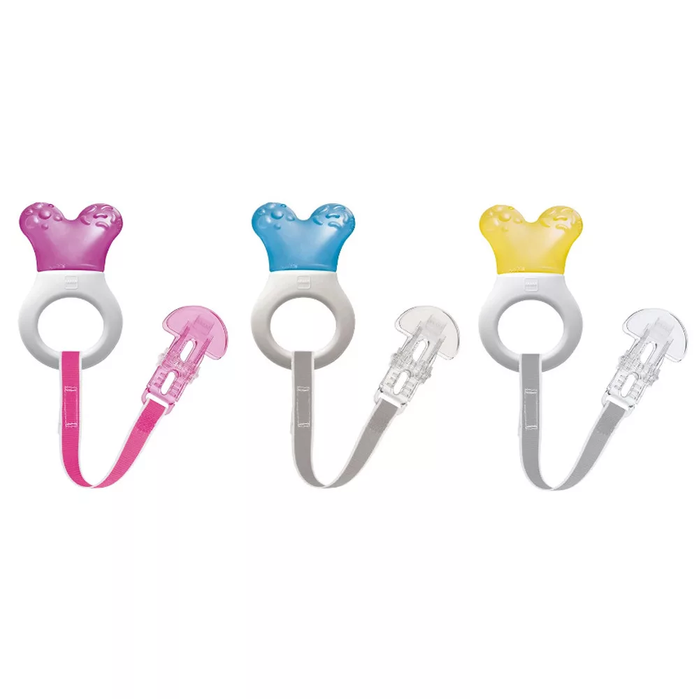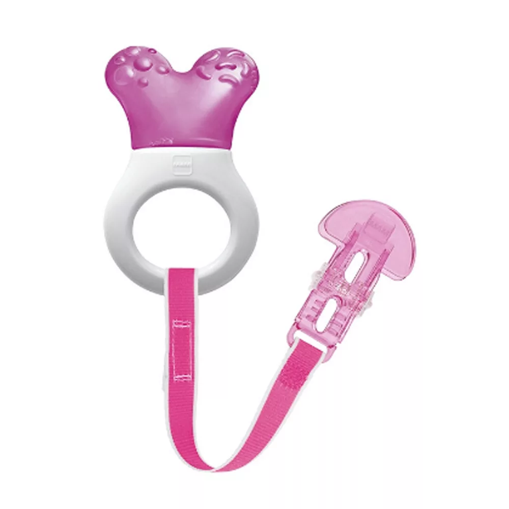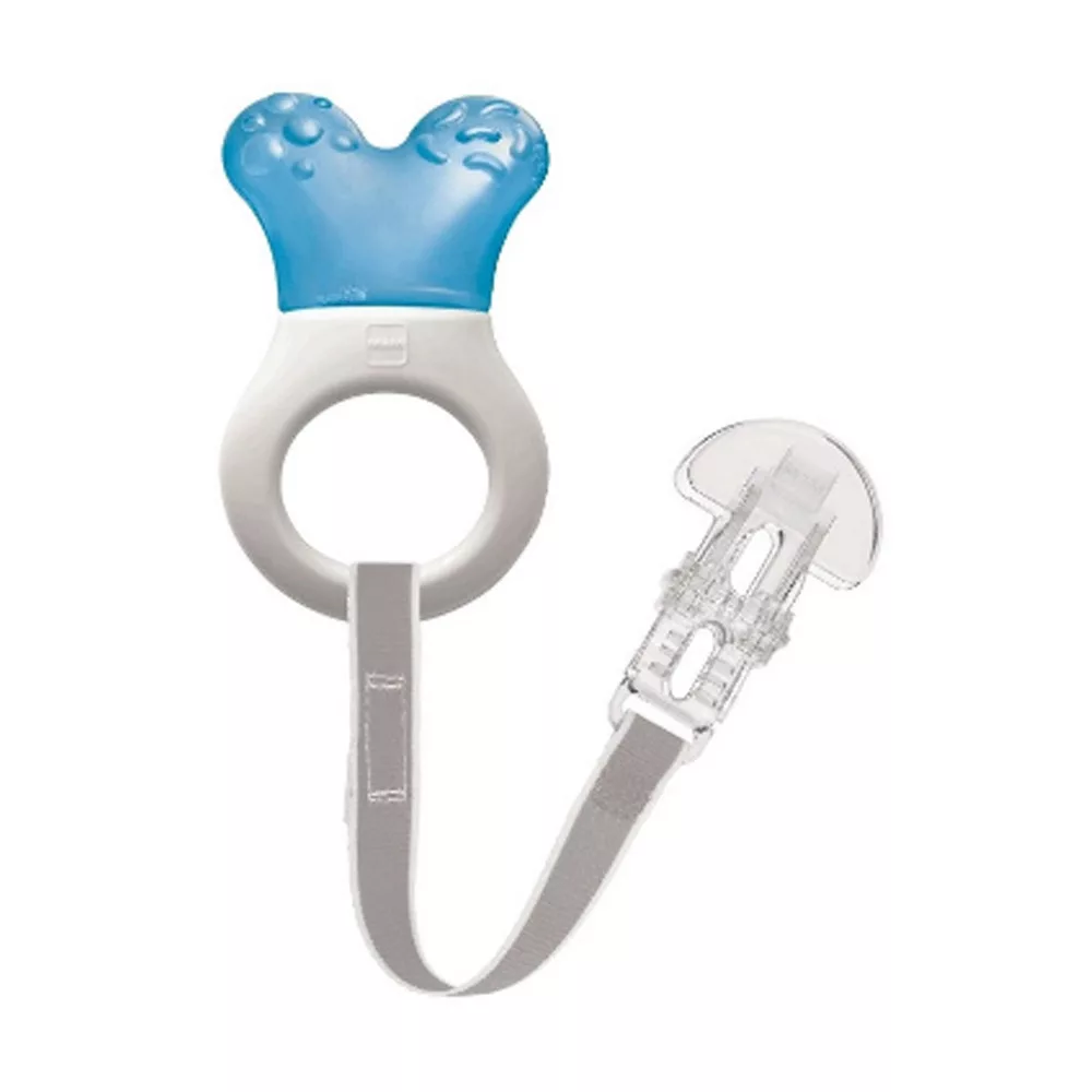A strukturált felület és a hűthető rész megkönnyíti a fogzást, és a rágókát izgalmassá teszi a baba számára.