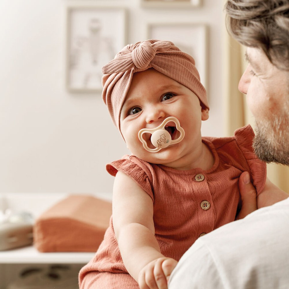 Az extra vékony és rugalmas szívóka lehetővé teszi a zárt szájtartást, hogy a babák természetes módon tudják becsukni a szájukat cumizás közben. Ez a fogaknak elegendő helyet hagy a normál növekedéshez. Az extra nagy szellőzőlyukaknak köszönhetően különösen kíméletes a babák érzékeny bőréhez.