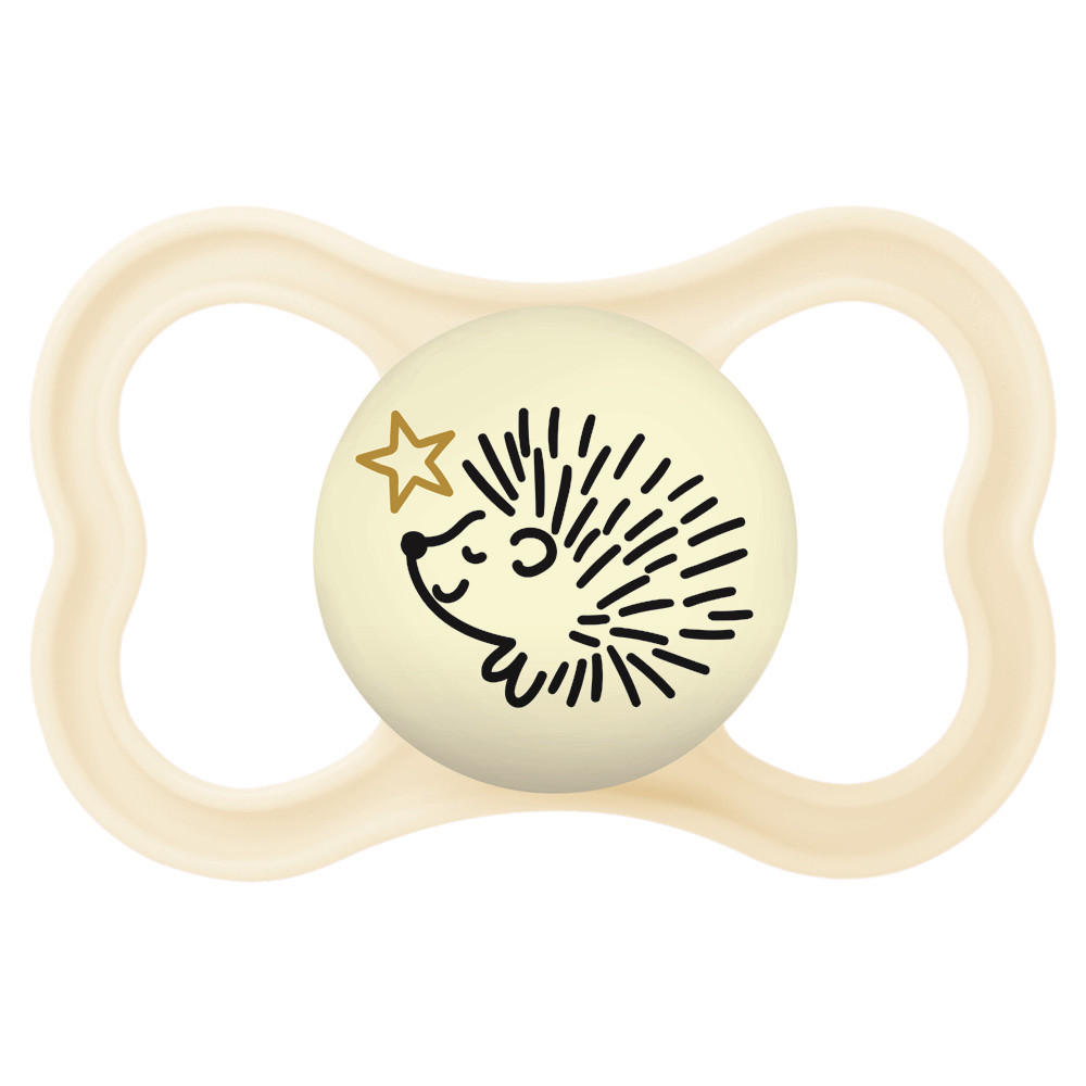 Az extra vékony és rugalmas szívóka lehetővé teszi a zárt szájtartást, hogy a babák természetes módon tudják becsukni a szájukat cumizás közben. Ez a fogaknak elegendő helyet hagy a normál növekedéshez. Az extra nagy szellőzőlyukaknak köszönhetően különösen kíméletes a babák érzékeny bőréhez. A cumi gombja világít a sötétben.
