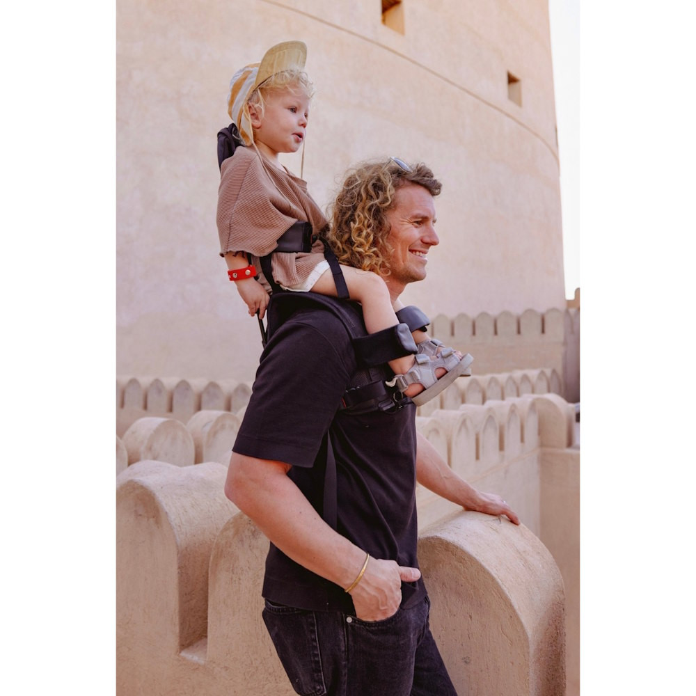 Miközben felfedezed a világot, gyermeked biztonságosan ül a válladon, és egy derékszíjjal, valamint lábszíjakkal van rögzítve, mindkettő stílusos műbőr részletekkel.