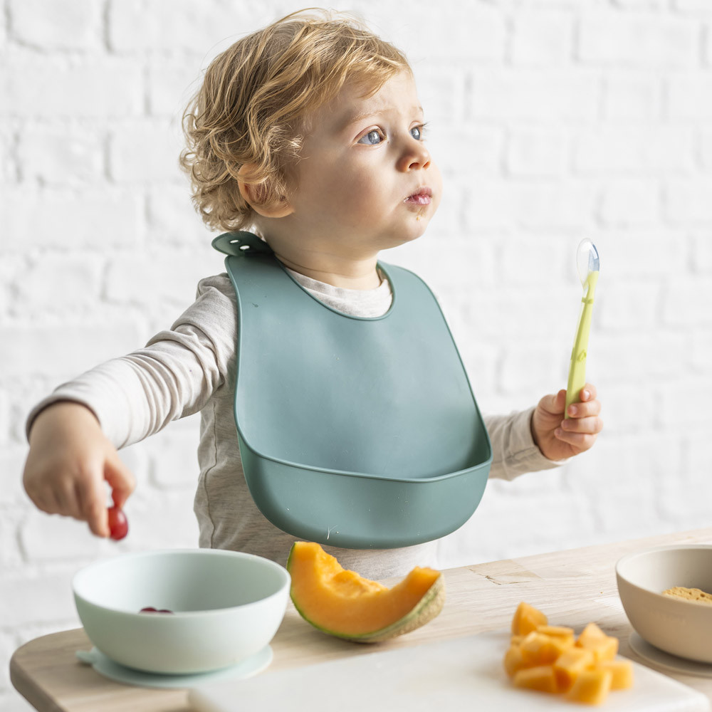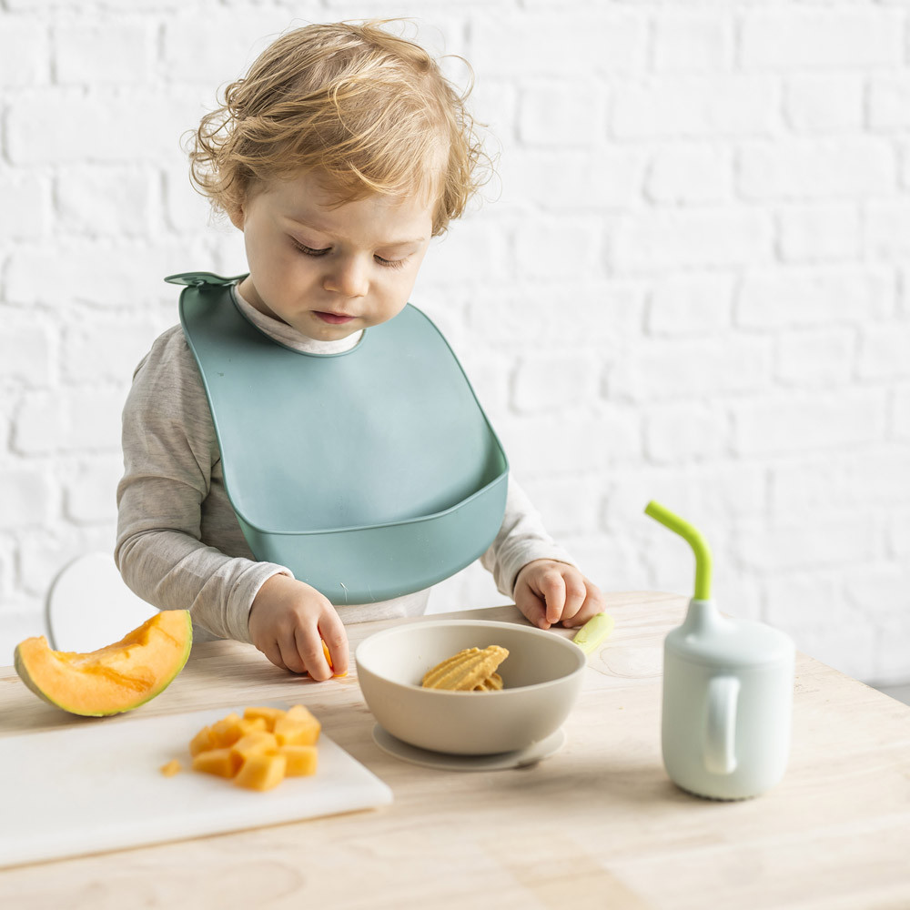 Ez a gyermekek számára készült étkészlet mindent tartalmaz, amire szüksége van az étkezés megkönnyítéséhez. Az előke úgy lett kialakítva, hogy a kicsi tisztán és kényelmesen tartsa, míg az ivópohár a hozzáillő szívószállal, kanállal és tálkával kifejezetten úgy készült, hogy a kis kezek is könnyen megfogják. Az étkészlet BPA-mentes puha szilikonból készült a kicsik számára. Ez a készlet tökéletes arra, hogy megtanítsa gyermekét önálló étkezésre. Mosogatógépben is mosható, így könnyen tisztítható.