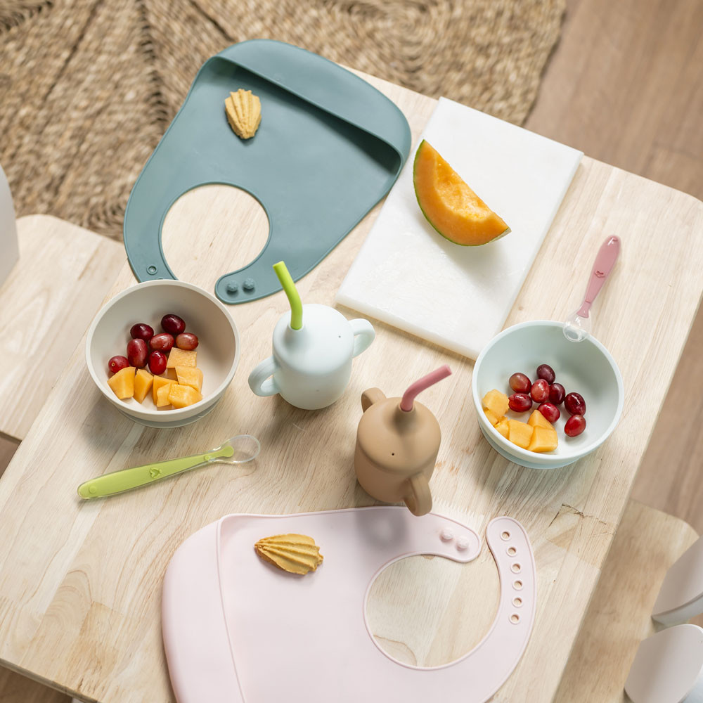 - az étkészlet puha, rugalmas szilikonból készült, amely leeséskor nem törik el.