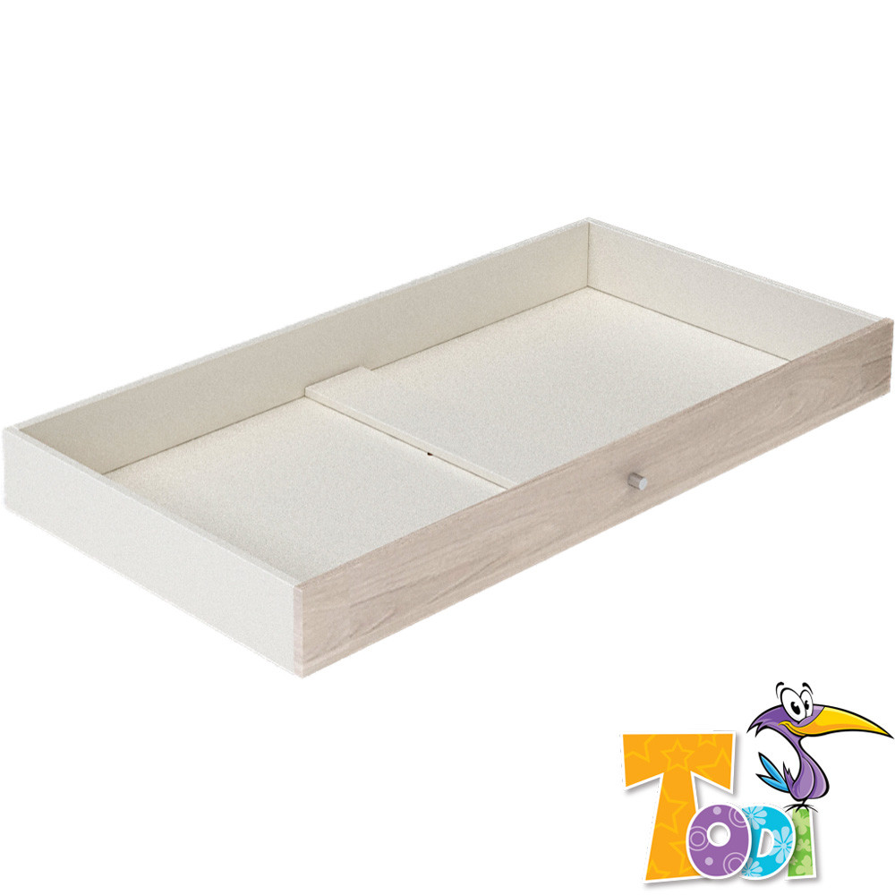 Elegáns, visszafogott, letisztult forma, ugyanakkor kellemes, harmónikus benyomást kelt. A cappuccino és a krémes vanília színek a szilfa természetességével melegséget, otthonosságot, nyugalmat árasztanak. A Teddy gurulós ágyneműtartó öt darab műanyag görgő segítségével teljes egészében kihúzható az ágy alól, megkönnyítve ezzel a fiók teljes mélységébe való pakolást. Mi minden férhet el egy majd 130 literes térfogatú gyerekbútorban? Először is ritkán használt játékok, plusz csomag pelenka, babaholmik, és persze természetesen az ágynemű. Mindez rejtve marad a kíváncsi szemek elől, mert minden gurulós ágyneműtartó tartozéka egy porfogó takarólemez és így nem látható annak tartalma. A laminált bútorlapból készült előlap élei 2 mm vastag Pvc-vel (un.: Abs) kerülnek élzárásra, melyek a hagyományos élfóliákhoz képest sokkal magasabb élettartamot biztosítanak.