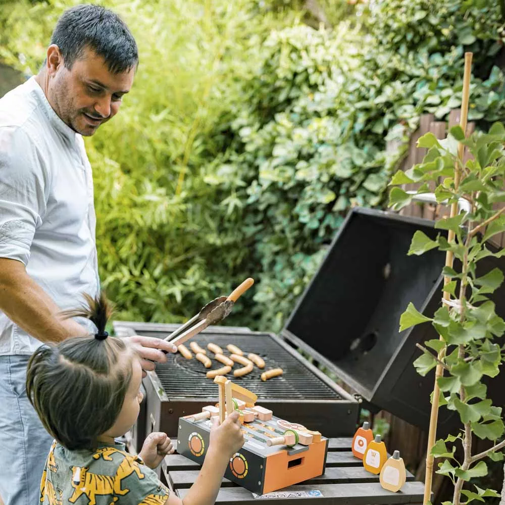 A fából készült grill egyben tárolódobozként is szolgál minden hozzávaló számára, amit a gyermek grillezni szeretne. Csak el kell csúsztatni a felső grill-lapot és alatta fából készült húsok, zöldségek, szószok, köretek, de tányér, evőeszközök és grillezéshez szükséges eszközök is megtalálhatók. A játék tartós bükkfából készült, és az összes felhasznált szín biztonságos az egészségre és vízbázisú.