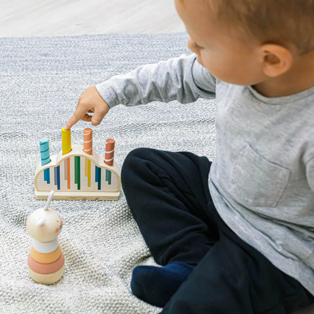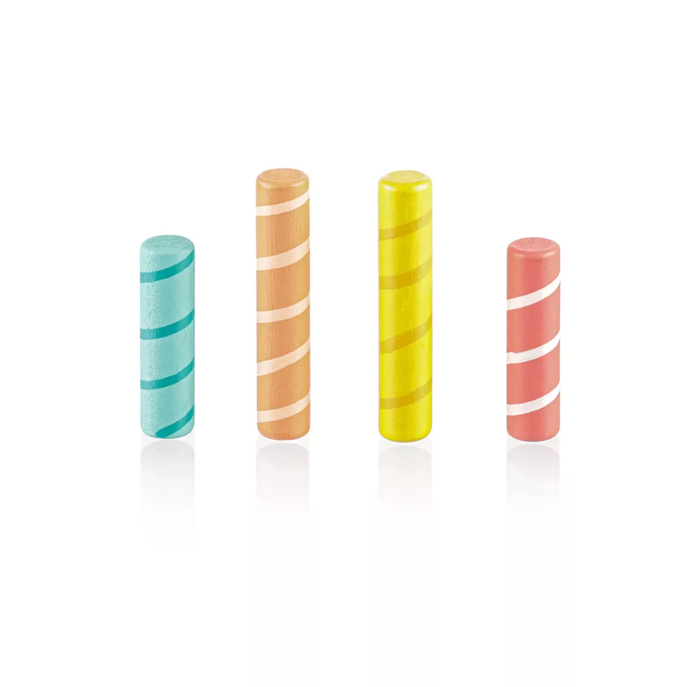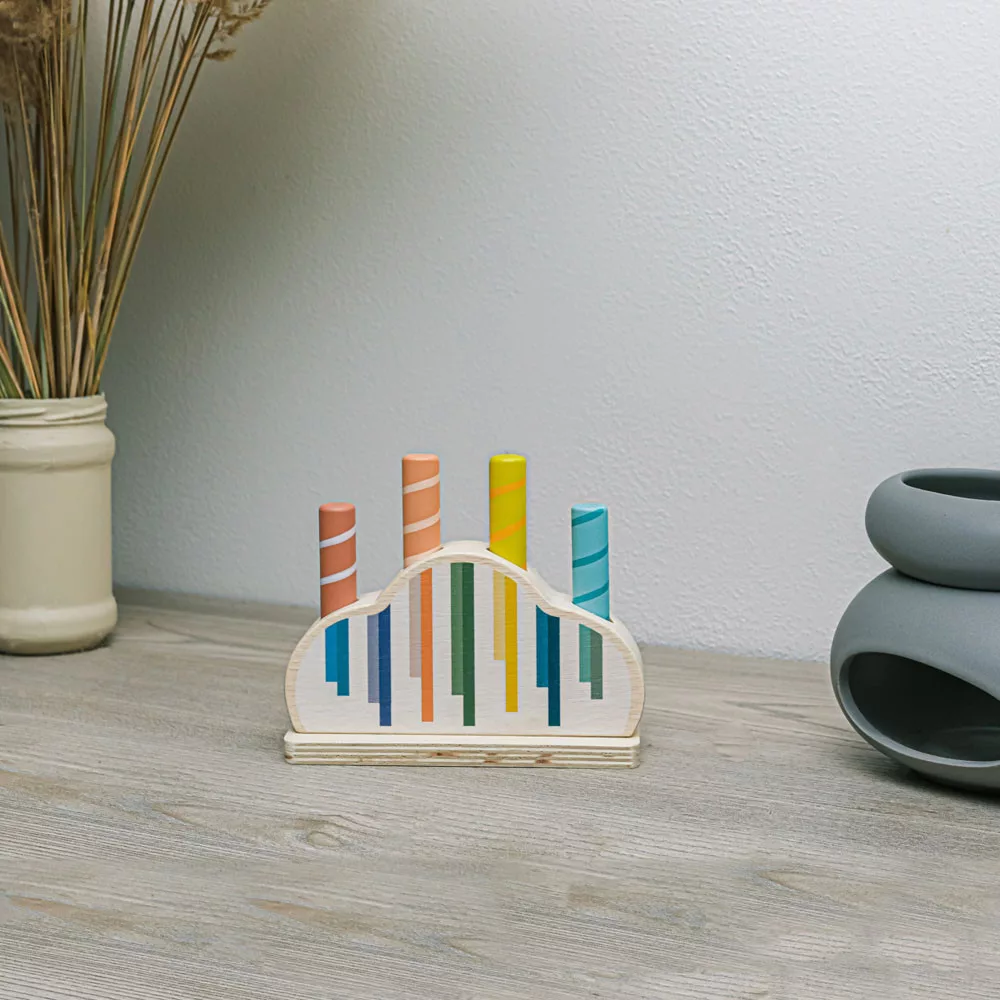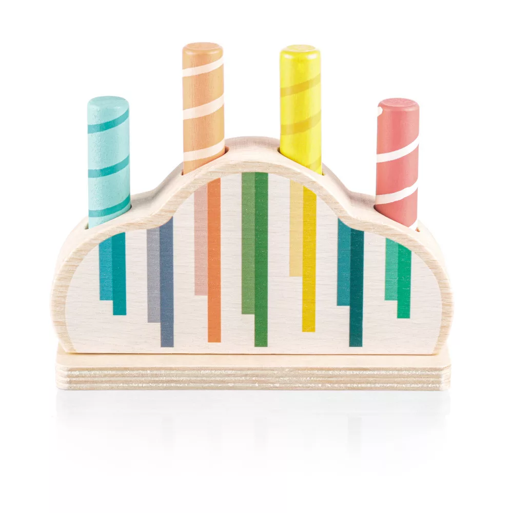 Színes csapok vannak rögzítve egy színes, rugóval ellátott fa alapba. Ha ezeket a csapokat finoman megnyomják, kioldódnak, és a rugó lehetővé teszi, hogy kiugorjanak. A játék fejleszti a motoros készségeket, a koordinációt és a koncentrációt, így ideális a korai tanuláshoz. Természetes bükkfából és vízbázisú festékekből készült.