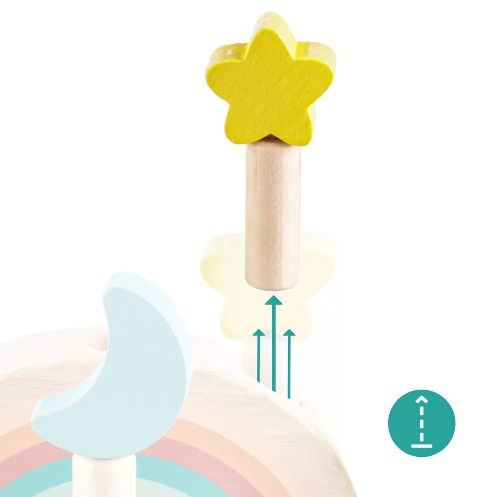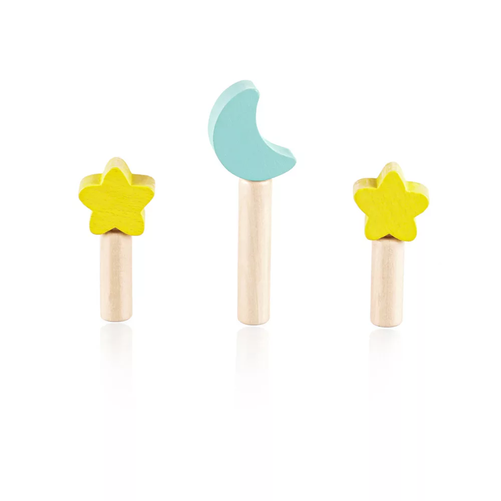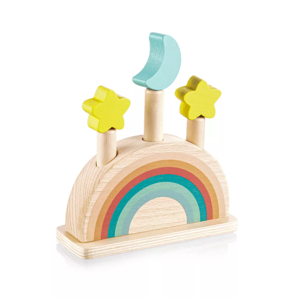 Színes csapok vannak rögzítve egy színes, rugóval ellátott fa alapba. Ha ezeket a csapokat finoman megnyomják, kioldódnak, és a rugó lehetővé teszi, hogy kiugorjanak. A játék fejleszti a motoros készségeket, a koordinációt és a koncentrációt, így ideális a korai tanuláshoz. Természetes bükkfából és vízbázisú festékekből készült.