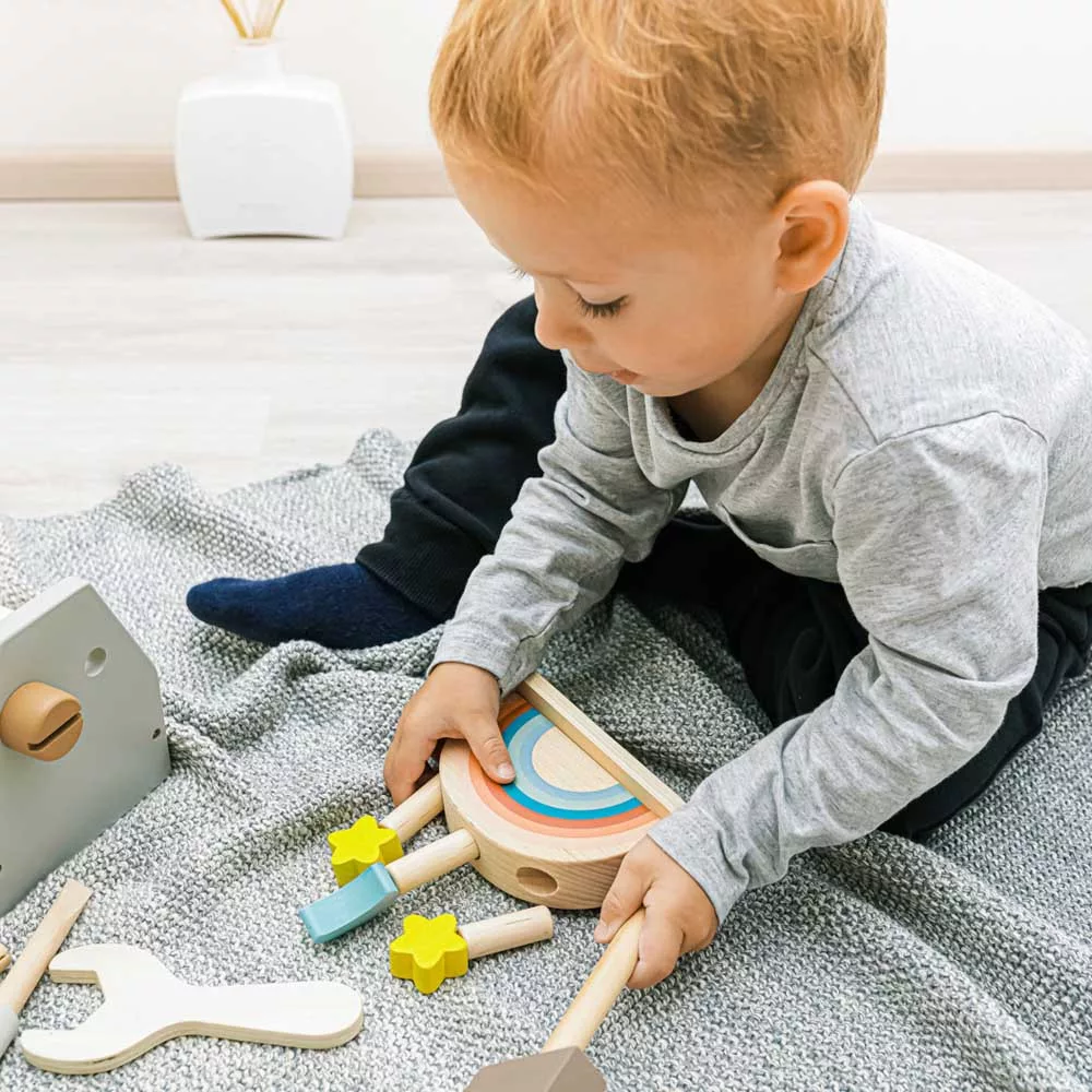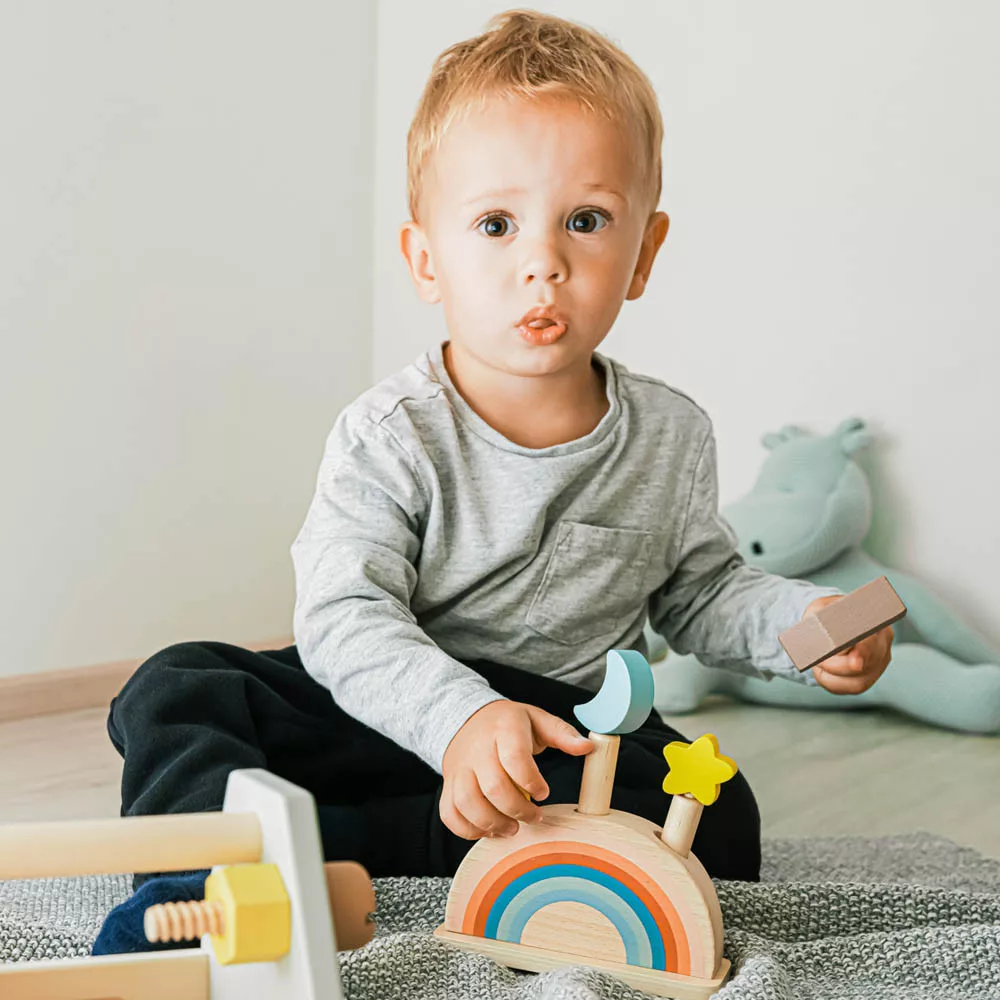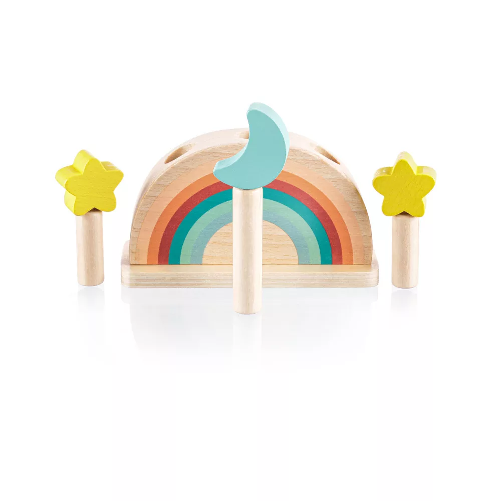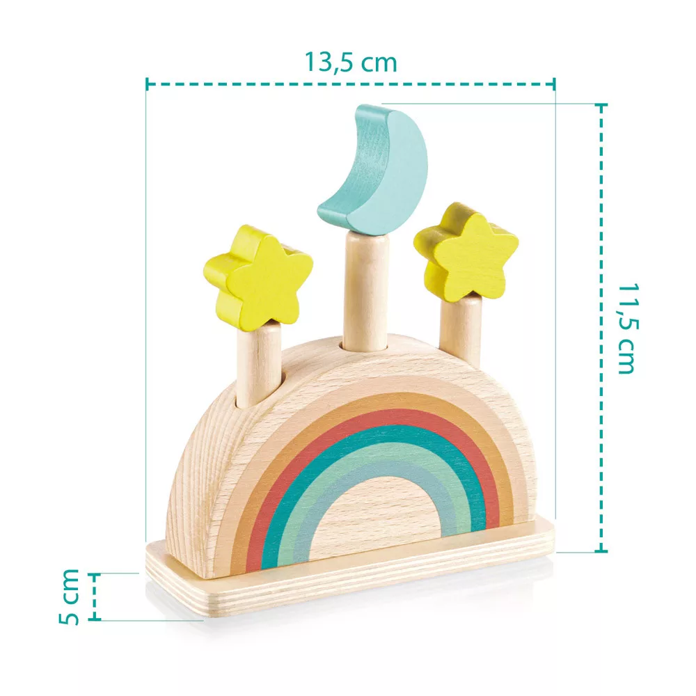 Színes csapok vannak rögzítve egy színes, rugóval ellátott fa alapba. Ha ezeket a csapokat finoman megnyomják, kioldódnak, és a rugó lehetővé teszi, hogy kiugorjanak. A játék fejleszti a motoros készségeket, a koordinációt és a koncentrációt, így ideális a korai tanuláshoz. Természetes bükkfából és vízbázisú festékekből készült.
