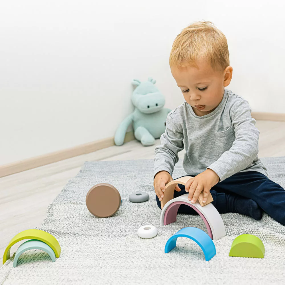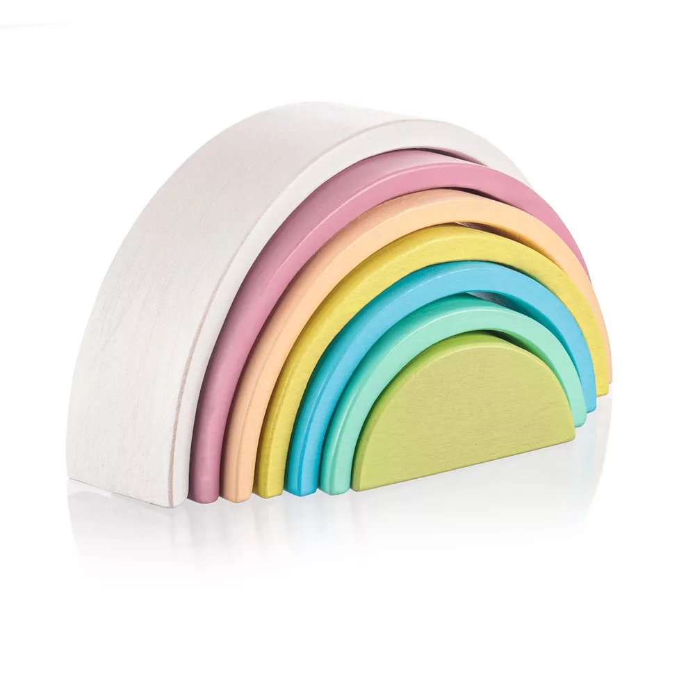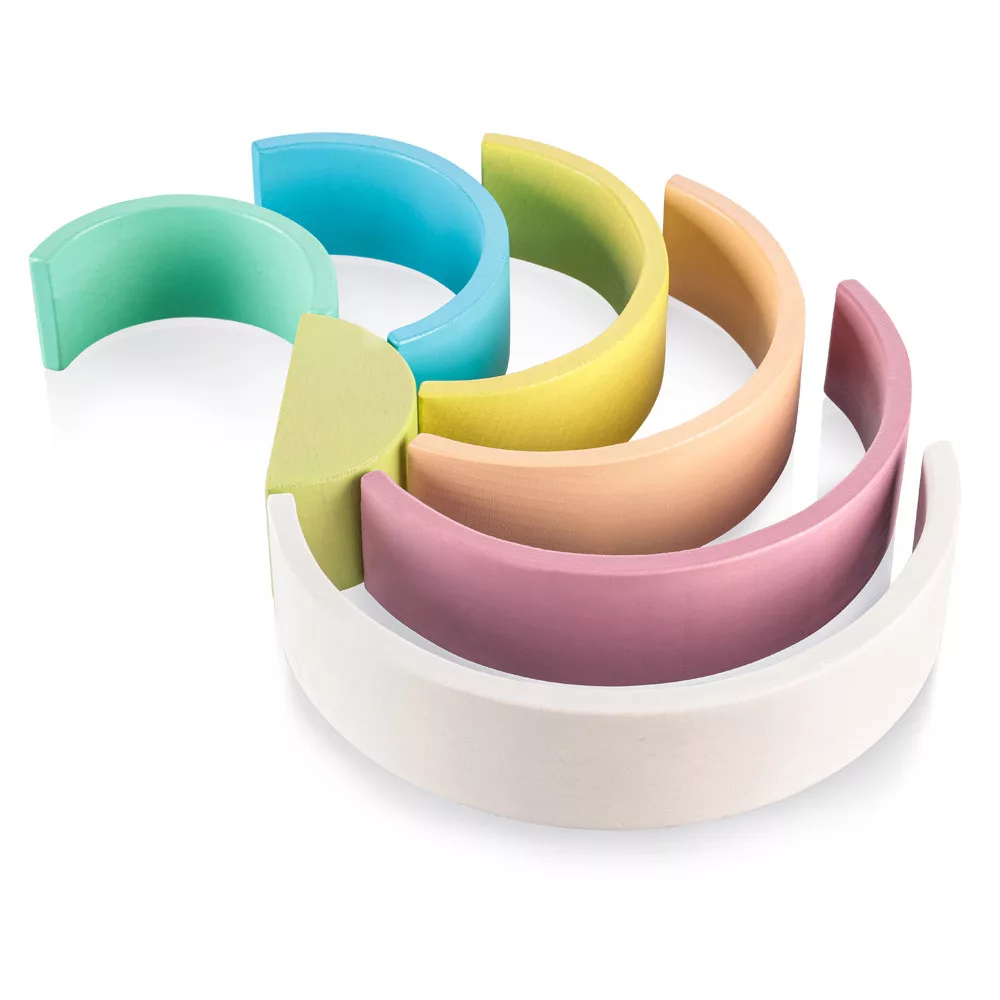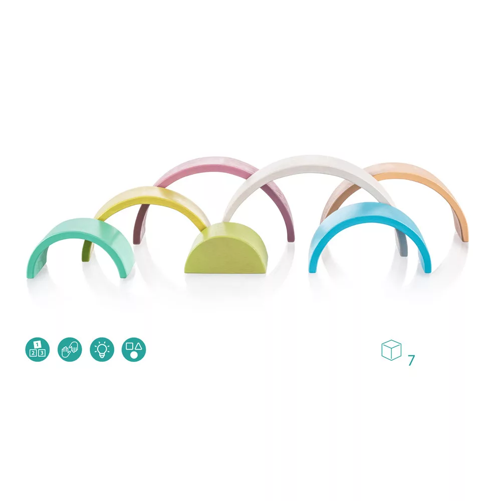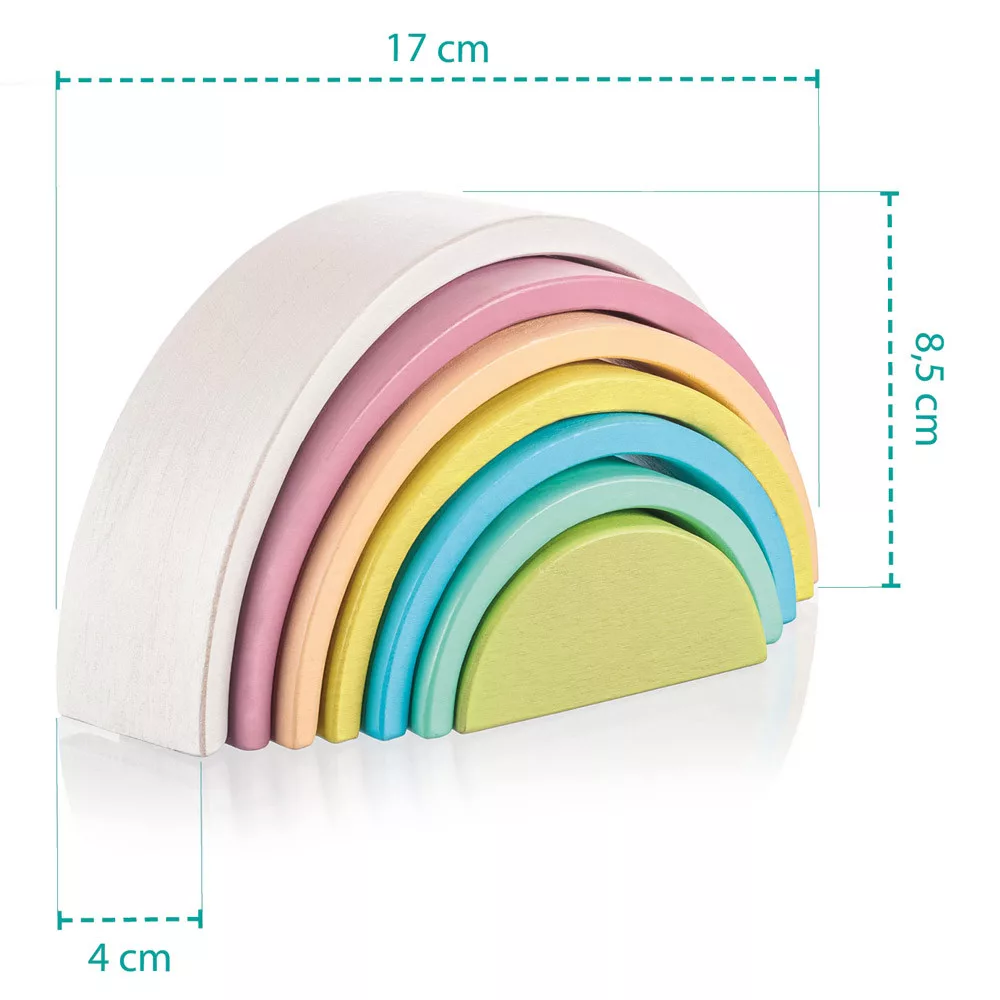Az aranyos szivárvány formájú és színű játék nagyszerű segítőtárs a gyerekek motorikus fejlődéséhez, képzelőerejének és kreativitásának fejlesztéséhez. A kirakós játékból különféle formákat lehet létrehozni. A készlet 7 színes, minőségi bükkfából készült darabot tartalmaz.