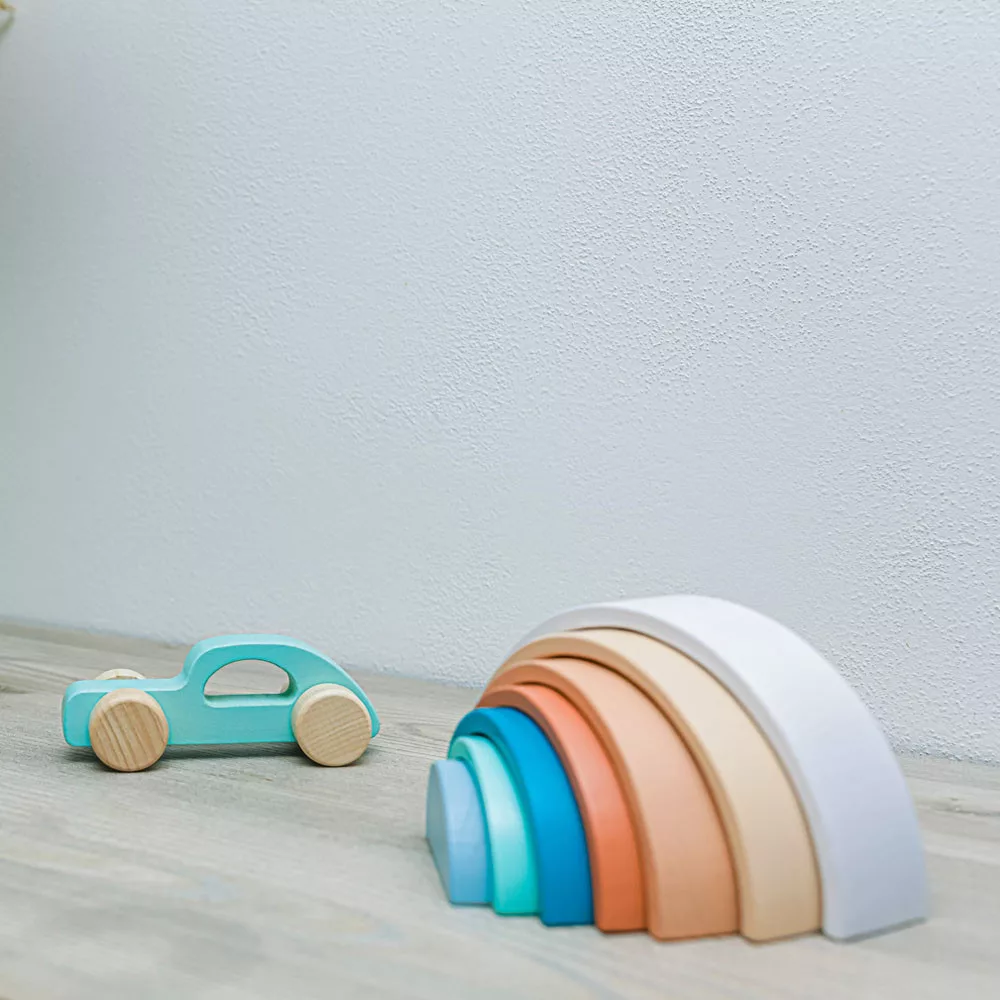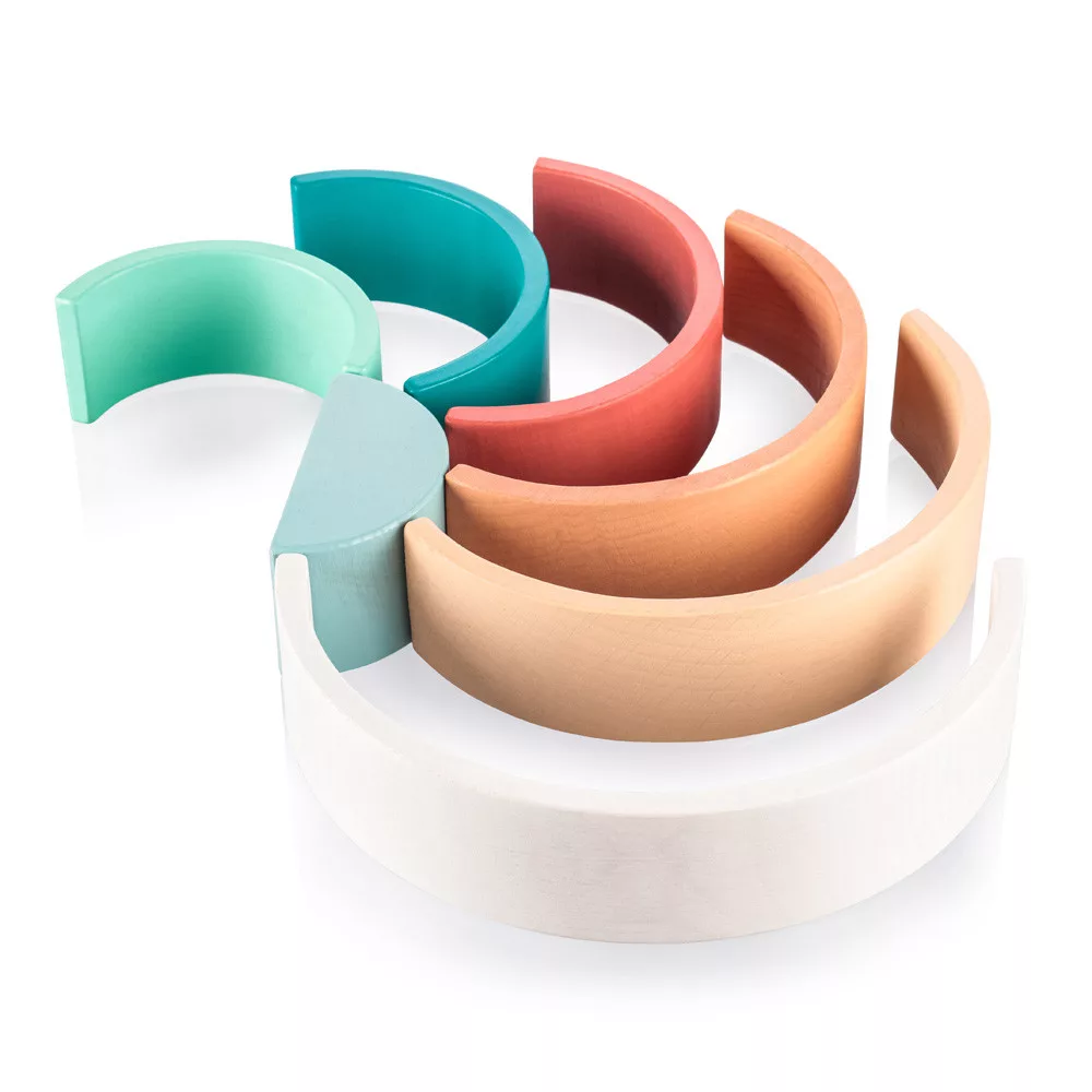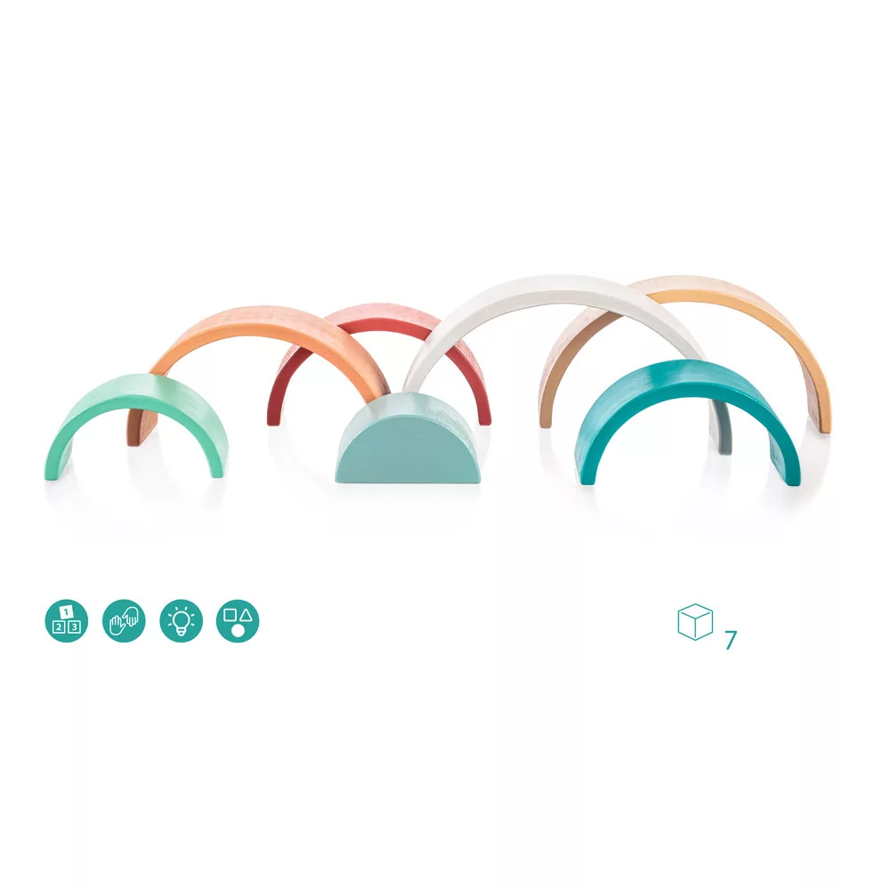 Az aranyos szivárvány formájú és színű játék nagyszerű segítőtárs a gyerekek motorikus fejlődéséhez, képzelőerejének és kreativitásának fejlesztéséhez. A kirakós játékból különféle formákat lehet létrehozni. A készlet 7 színes, minőségi bükkfából készült darabot tartalmaz.