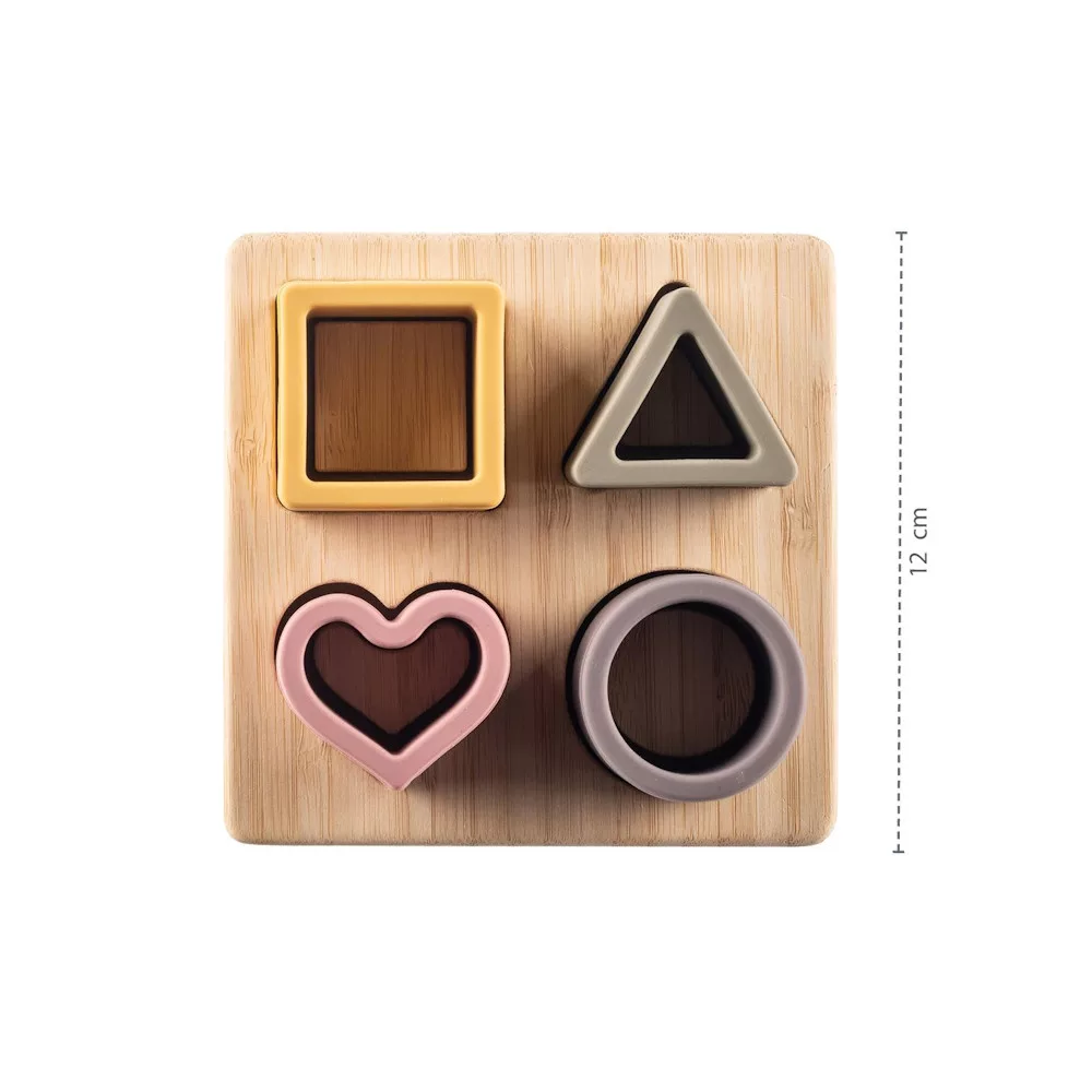 Élelmiszeripari minőségű szilikon formák, bambusz tálca, 4 féle forma, Montessori játék, finommotorika fejlesztés, szem-kéz koordináció fejlesztés, színeket tanít, gyerekek első rejtvénye - ez a Zopa szilikon és bambusz formaberakó.