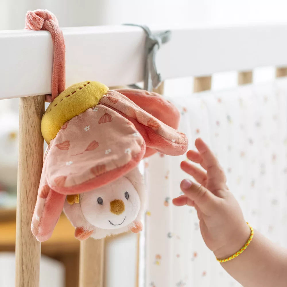 Nagyon cuki kis játék, ami felhúzva vibrálva megy felfelé. Gyorsan az újszülöttek és csecsemők legjobb játszótársa lesz. Játékos és fejlesztő játék egyaránt, serkenti a baba motoros készségeit és veleszületett prehenziós reflexeit. Aranyos kialakítás fülekkel, karokkal és lábakkal a megfogáshoz. Koraszülötteknek is alkalmas, ideális a baba stimulálására. A praktikus szalagoknak köszönhetően a járókára, kiságyra vagy babakocsira is rögzíthető.