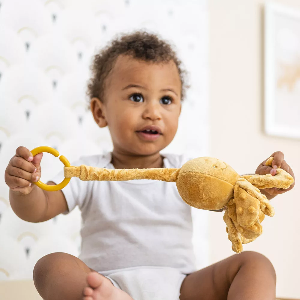 Nagyon cuki kis polip, ami felhúzva vibrálva megy felfelé. Gyorsan az újszülöttek és csecsemők legjobb játszótársa lesz. Játékos és fejlesztő játék egyaránt, serkenti a baba motoros készségeit és veleszületett prehenziós reflexeit. A csápok mind puhák, pont akkorák, mint a babák kicsi kezei, enyhe dudorokkal, amelyek felkeltik a kíváncsiságát és a tapintását. Koraszülötteknek is alkalmas, ideális a baba stimulálására.